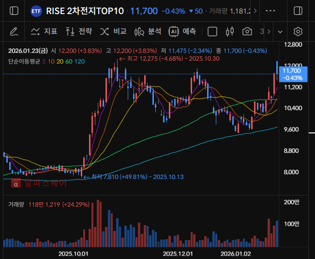 - 2차전지 ETF (RISE 2차전지TOP10 등): 최근 3개월 수익률이 50% 이상을 기록하며 개별 종목의 변동성을 상쇄하는 안정적인 우상향 곡선을 그리고 있습니다. (출처: RISE ETF 1월 공시)