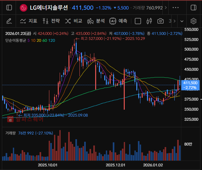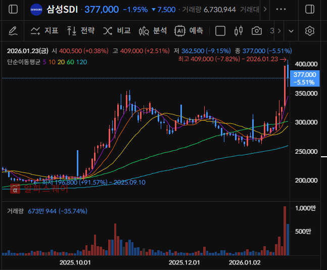 - 개별주 (삼성SDI/LG엔솔): 60일 이동평균선을 강하게 돌파하며 '정배열' 전환 시도 중. ESS 전용 라인 가동 소식이 차트에 반영되고 있습니다.