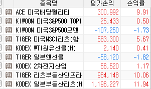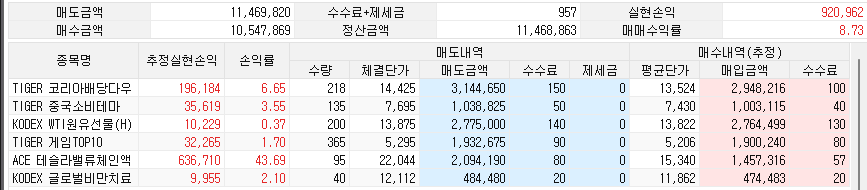 정산을 꽤 많이 한 한 주였습니다. 그리고 새로 매수도 좀 많이 해서 금리 ETF를 포함하지 않은 예수금은 계좌의 약 9% 수준 입니다. 그리고 2차 전지 산업 ETF를 새로 진입하였습니다.