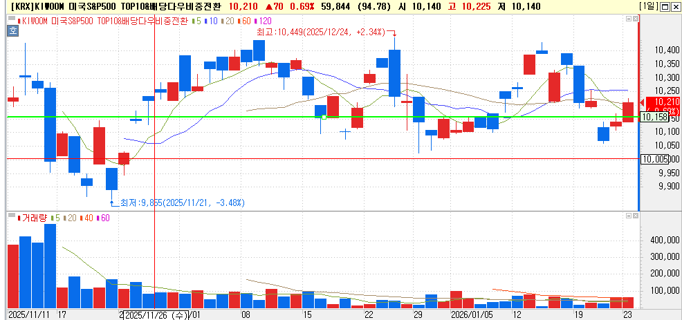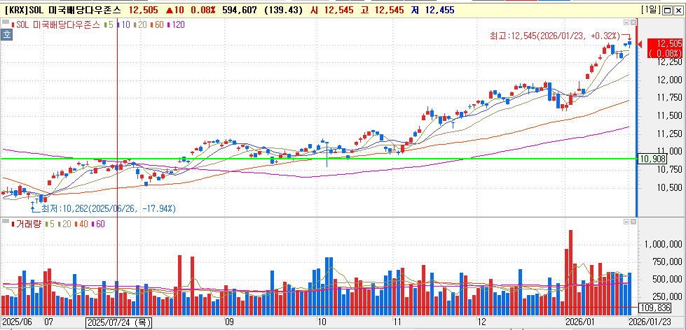 미국 SCHD를 추종하는 상품이라 대략 1년 전쯤 비쌀 때부터 모아가고 있었는데, 저점에서도 조금씩 꾸준히 사서 지금은 꽤 좋은 평단가가 되었습니다. 월배당받으면서 흐름 지켜보도록 하겠습니다.