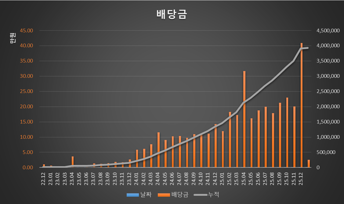 매달 월세를 주는 미국 / 한국 / 일본 세 종목입니다. 계좌 총 자산 5천만 원일 때, 세 종목 합이 계좌 50%로 비중을 맞췄었습니다. 25년 말 총 자산 8천만원인 시점에 각각 천만원 정도로 만들어 두고 월세(배당금)를 받고 시세 상승을 지켜만 보고 있습니다. 한 때 가장 좋았던 미국 리츠가 배당금도 그렇고 상승률도 가장 뒤처지고 있습니다.