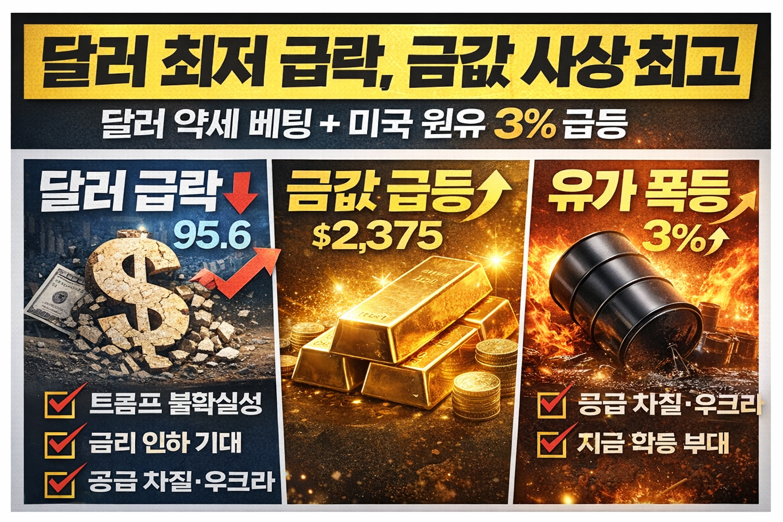 달러인덱스(DXY)는 4년 만에 최저 수준, 금 가격은 사상 최고치, 국제유가는 공급 차질 우려로 3% 급등했다.