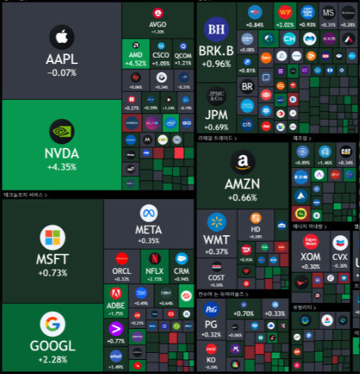 - 주요 기술기업 중에는 엔비디아가 다시 시가총액 2위에 오름. 테슬라가 3% 넘게 올랐고 알파벳도 2%대 강세를 보임