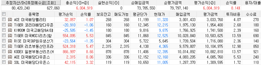 가격 상승율은 좀 미미한 편인 한국판 SCHD 입니다. 다른 날짜에 배당금이 들어오는 상품은 ACE인데.. SOL은 비중도 적어서 정리를 한번 할까 고민중이긴 합니다.